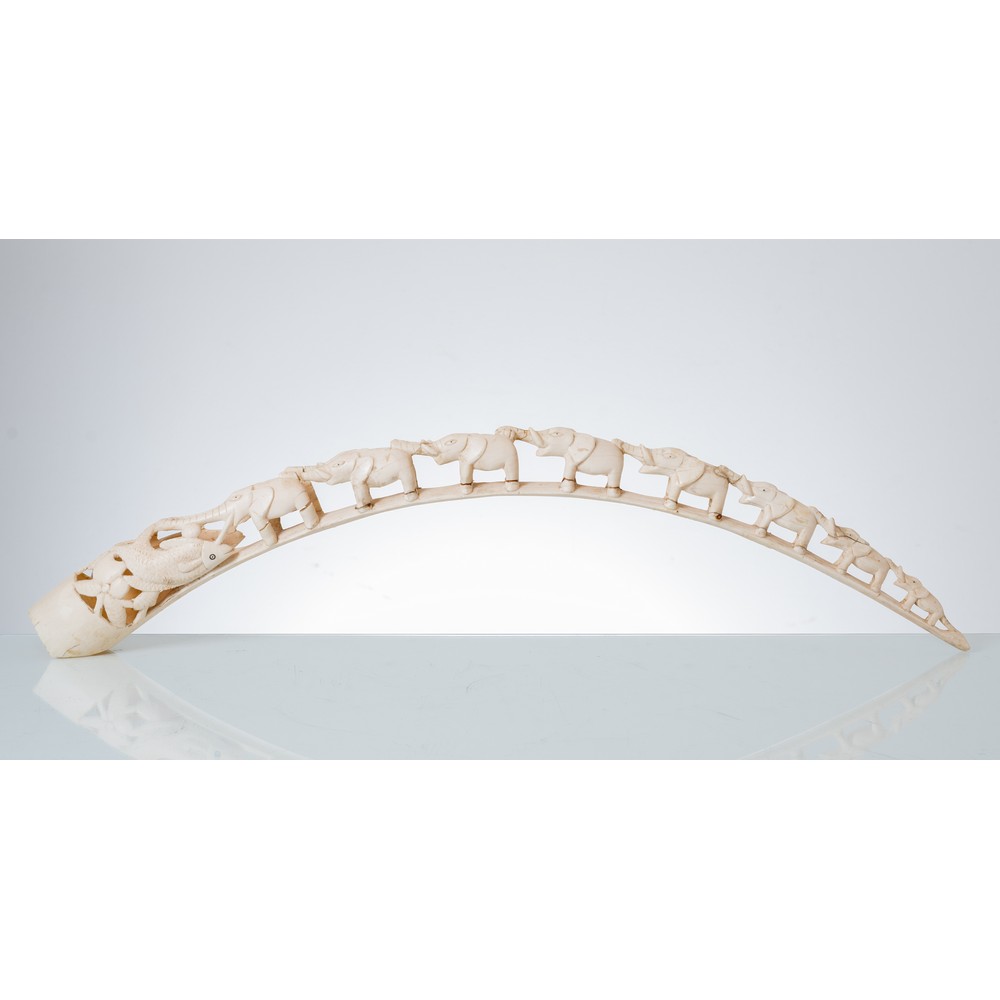 Zanna in avorio lavorato raffigurante "Elefanti in marcia". L'opera è corredata da certificato Cites.