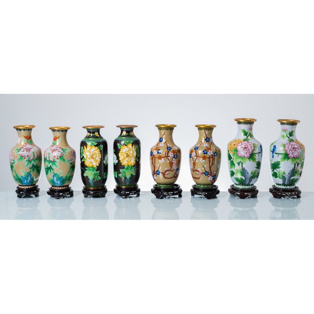 Quattro coppie di vasi cloisonné con decori a motivo floreale e fogliaceo.