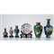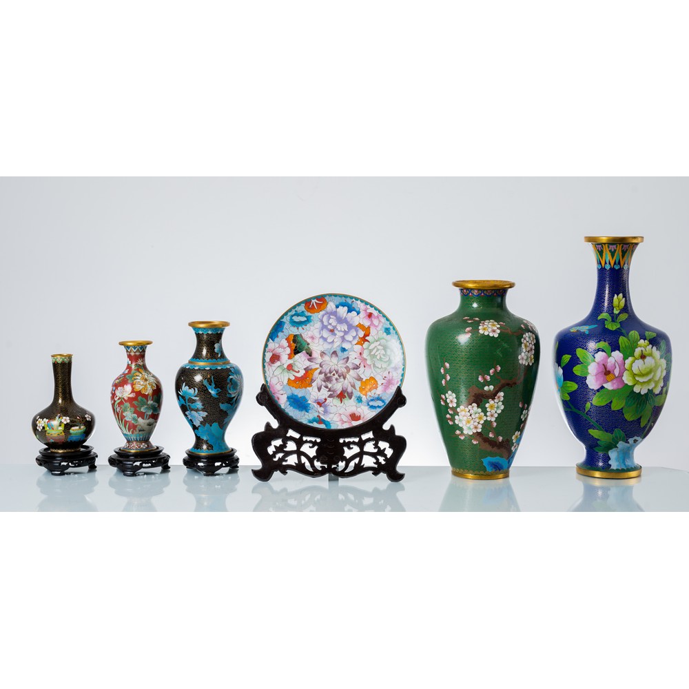 Cinque vasi e piatto cloisonné con decori a motivo floreale.