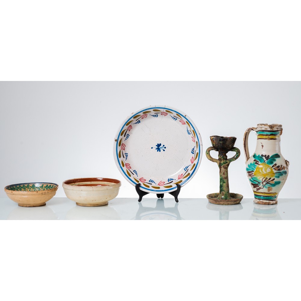 Piccola quartara, lumiera, piatto e due ciotole in ceramica decorata e smaltata (usure e mancanze).