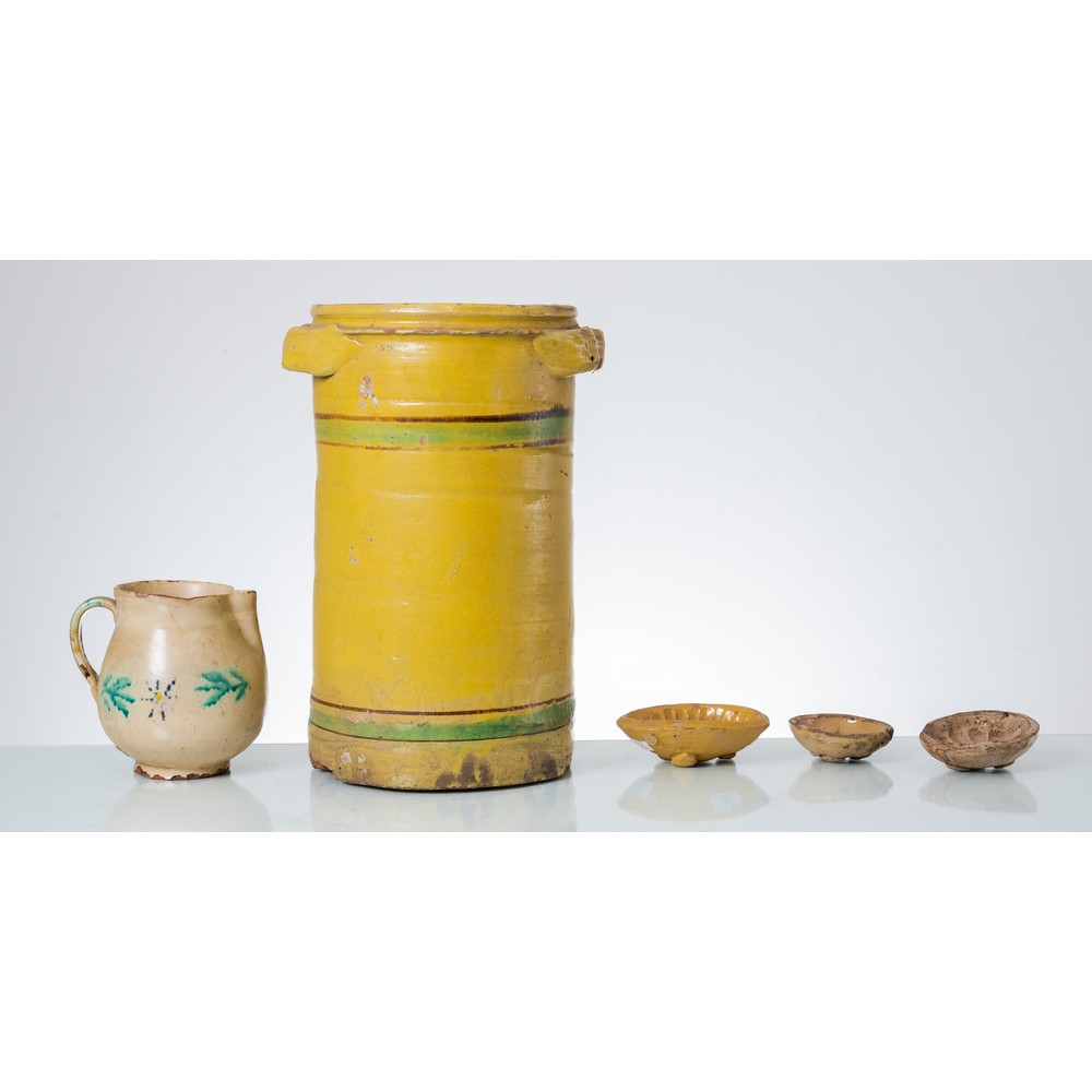 Vaso contenitore, piccola cannata e tre formelle per cotognata in ceramica decorata e dipinta (usure).