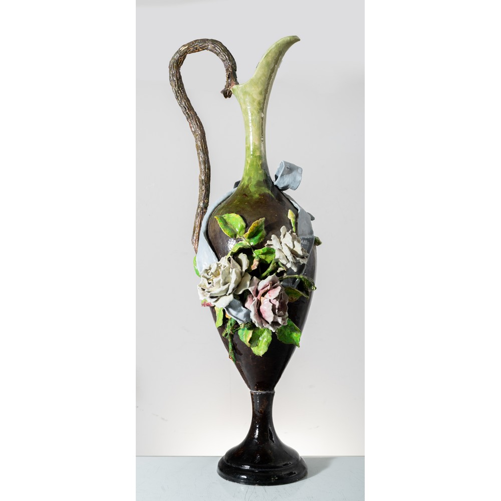 Anfora in ceramica smaltata e decorata con applicazioni a motivo fogliaceo e floreale con nastro (usure e difetti).