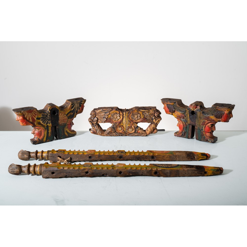 Cinque elementi da carro in legno laccato e decorato.