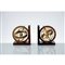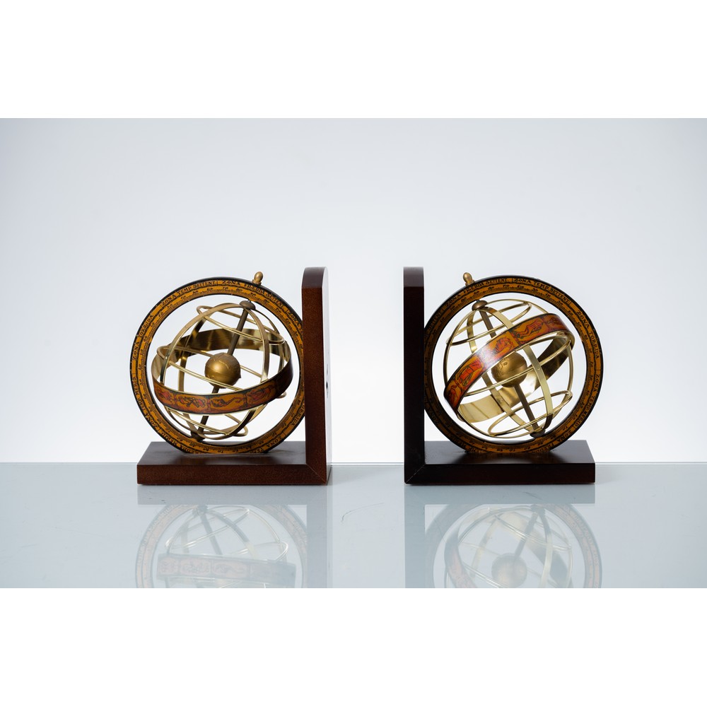 Coppia di reggilibri in legno con sfera armillare.