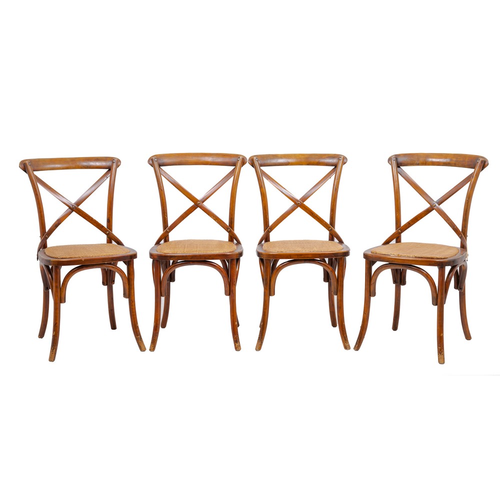 Quattro sedie in legno di faggio curvato a fuoco, spalliera a crociera.