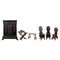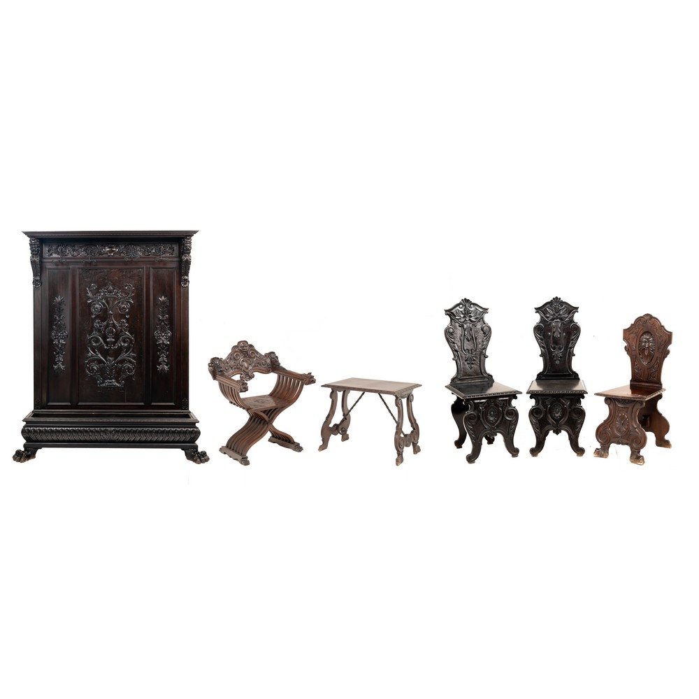 Ingresso stile rinascimentale riccamente lavorato in legno ebanizzato composto da grande cappelliera, tre sedie, tavolino e savonarola.