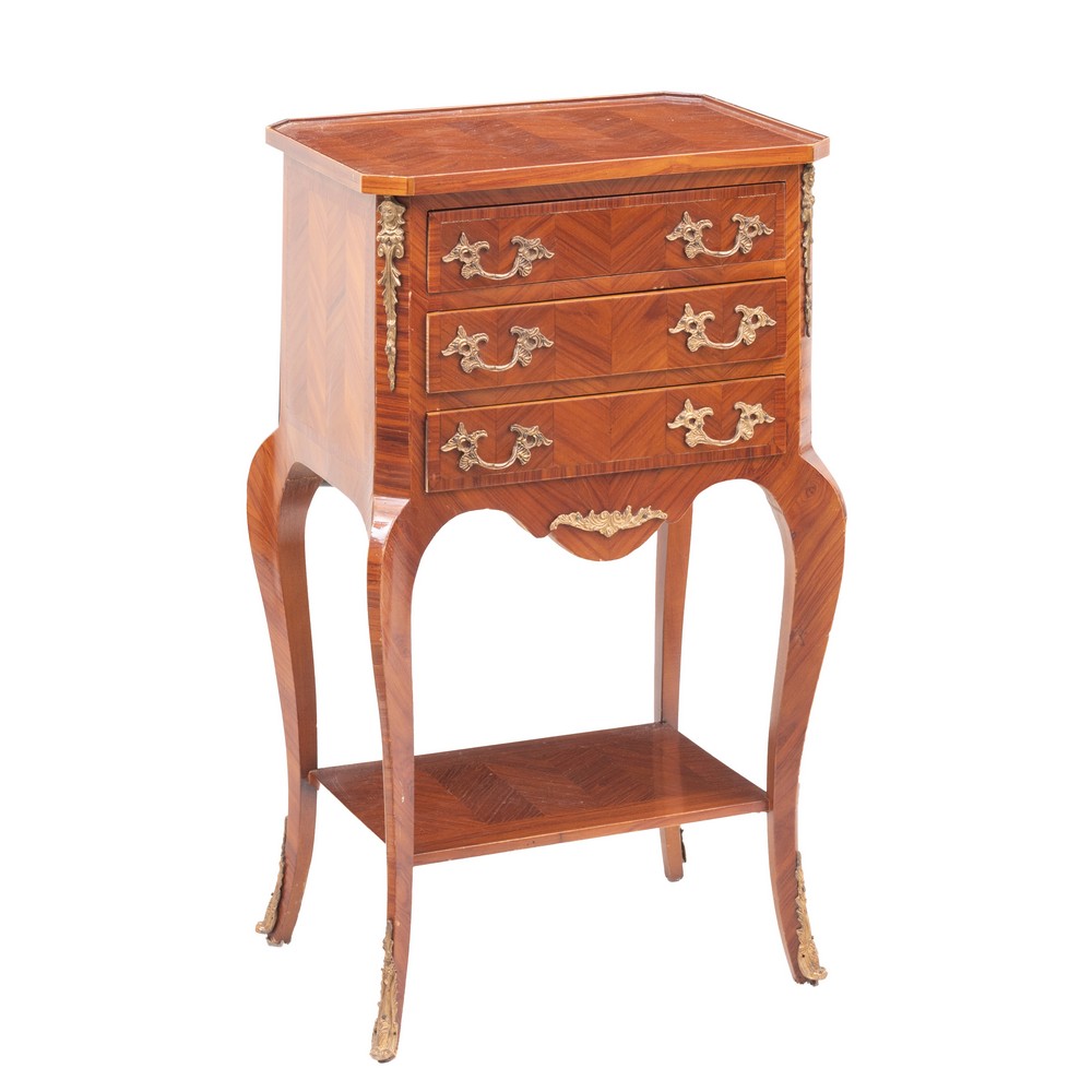 Piccolo mobile a tre cassetti in bois de rose con varie essenze di legno da frutto.