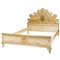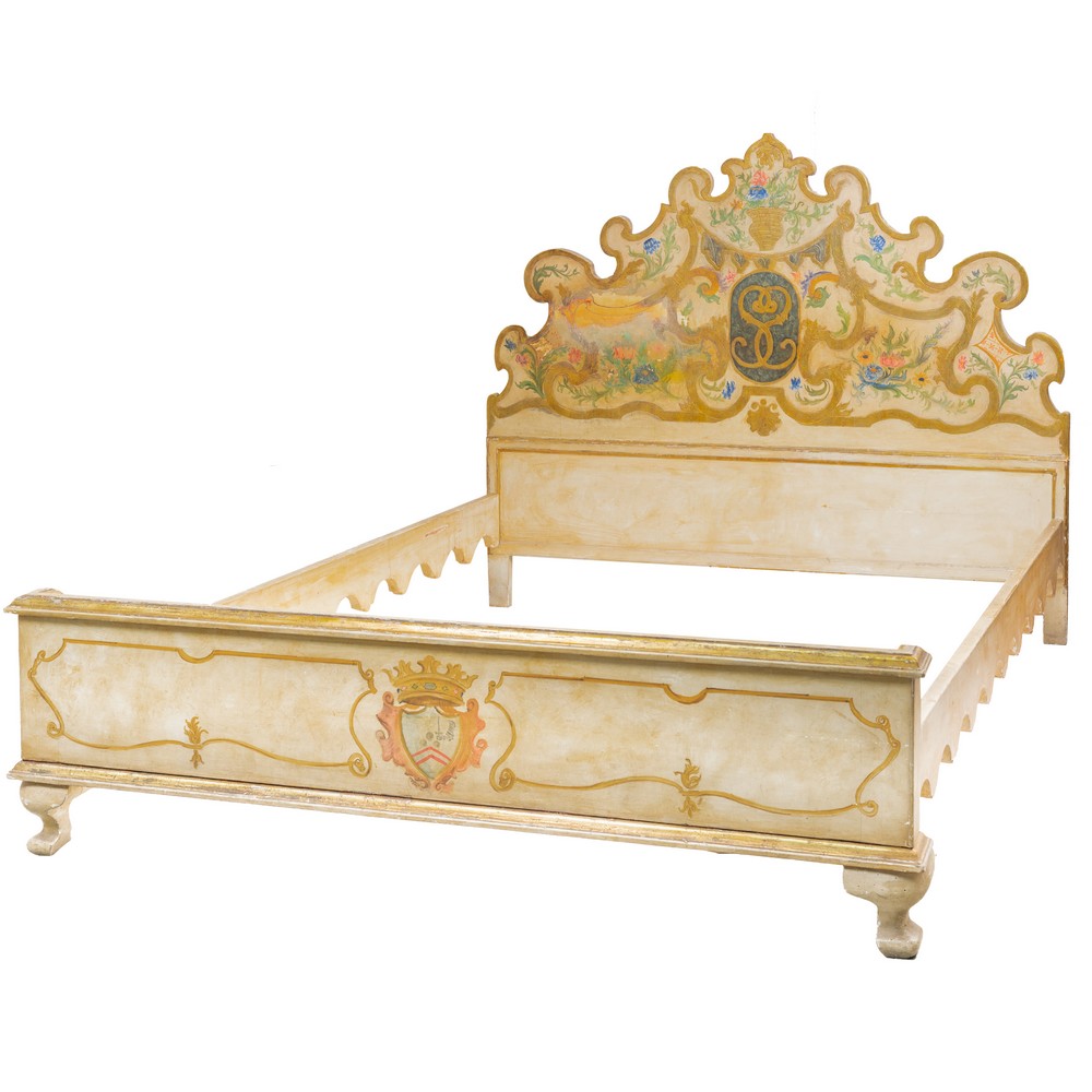 Letto matrimoniale di gusto settecentesco in legno laccato, dorato e decorato a mano con disegni araldici, composto da testata, pediera e barre di sostegno laterali.