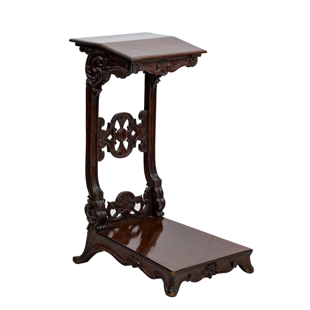 Inginocchiato in legno di noce con cuscino in stoffa lavorato a mano.