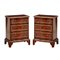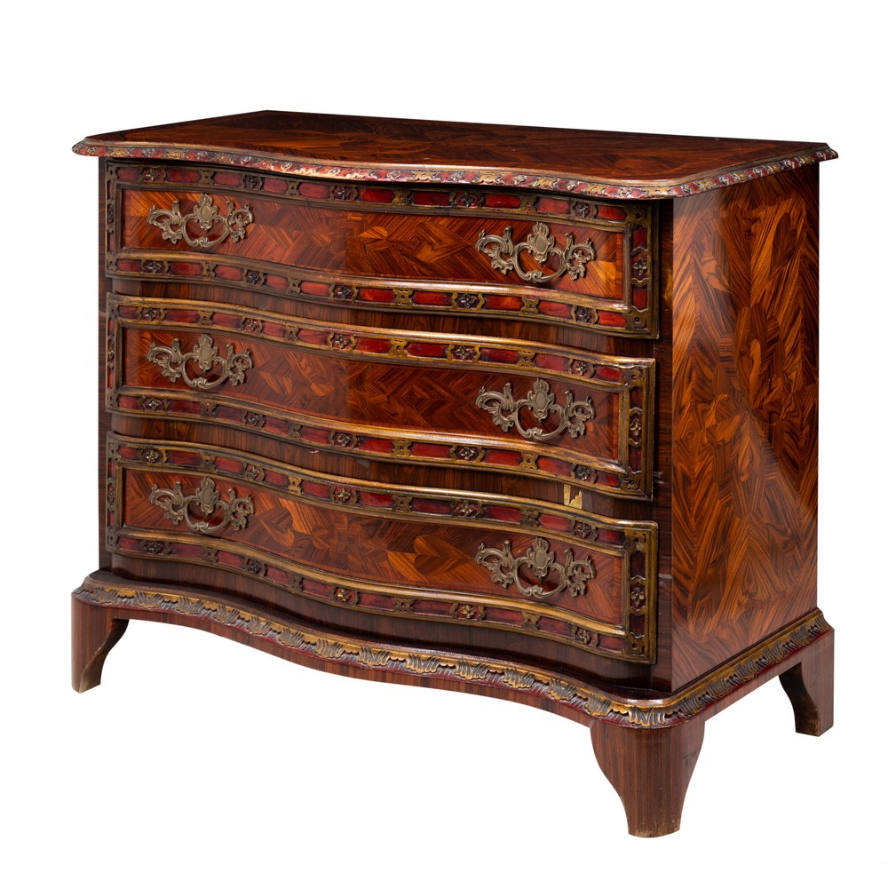 Trittico composto da cassettone a tre cassetti e due comodini in ebano violetto, maniglie in bronzo e lumeggiature in oro.