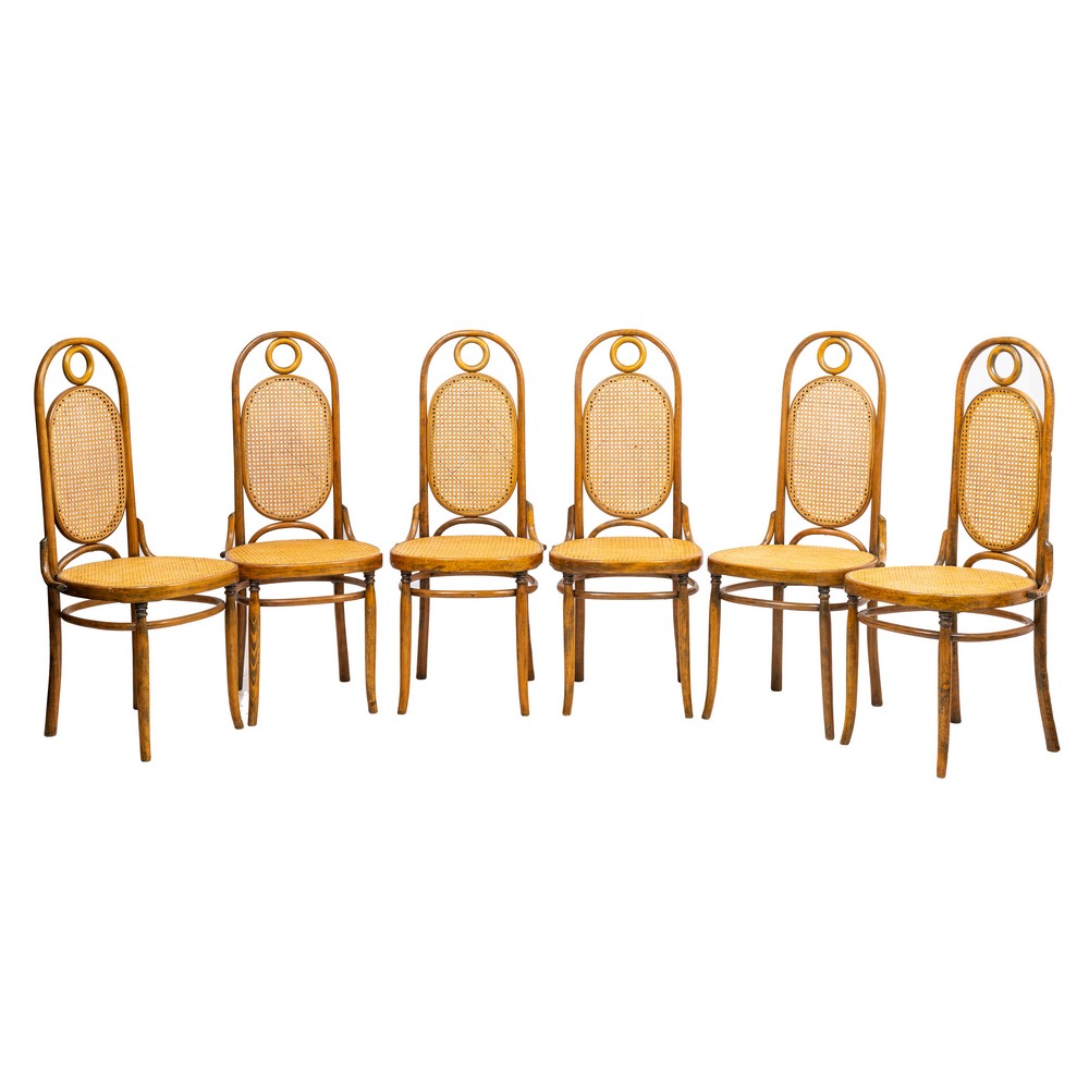 Sei sedie tipologia Thonet in legno di faggio curvato a fuoco, sedute e spalliere in paglia di Vienna.