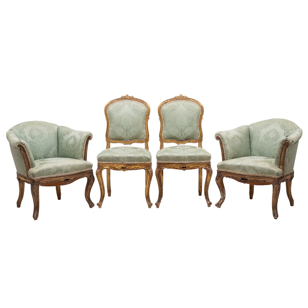 Coppia di poltrone a pozzetto e due sedie di gusto barocco in legno dorato (usure).
