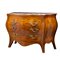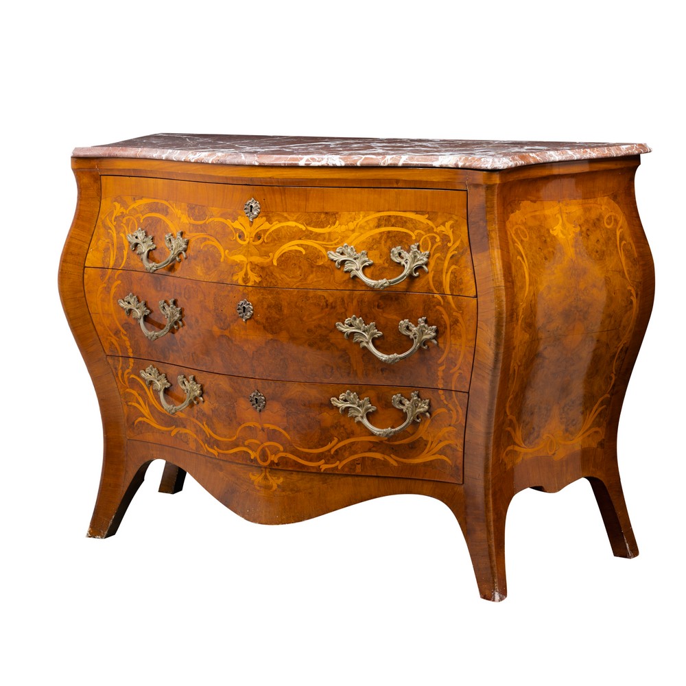 Cassettone di gusto settecentesco in legno di noce e radica di noce, tarsie in bosso, maniglie in bronzo, piano in marmo rosso di Francia.
