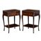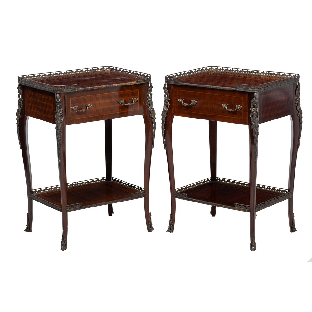 Coppia di piccoli mobili di gusto francese con cassetto centrale in legno di mogano, intarsi a marchetteria in legni vari a disegno geometrico, ringhiere ed applicazioni in bronzo.