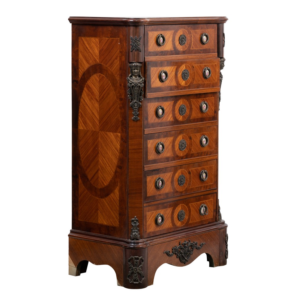 Cassettiera di gusto francese in radica di noce, legno rosa e tarsie in bosso, maniglie in bronzo e placche in porcellana.