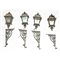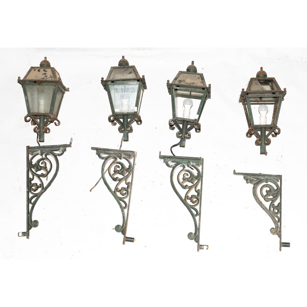 Quattro fanali da muro con bracci in ghisa.