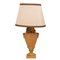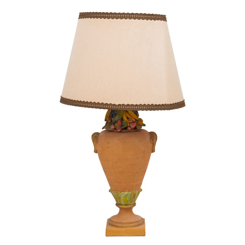Lume in terracotta con parte superiore guarnita da frutta e foglia con paralume.
