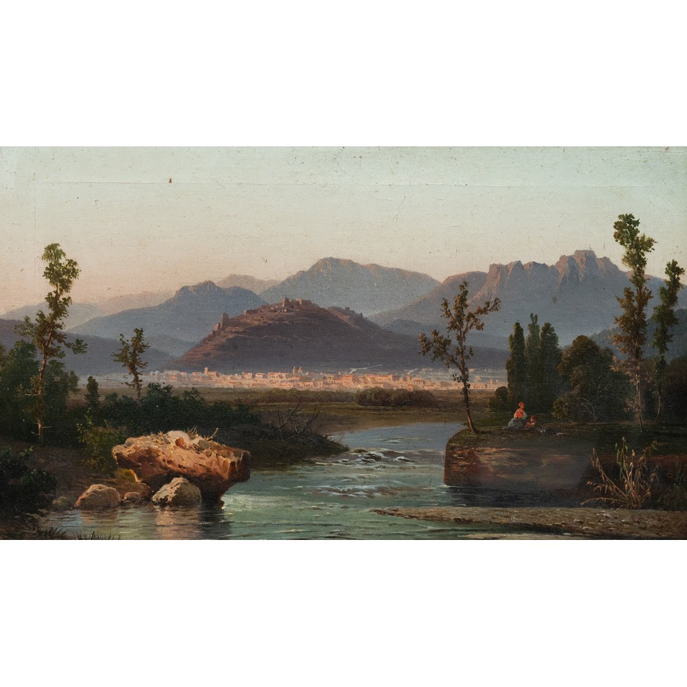 Paesaggio fluviale con veduta di città
