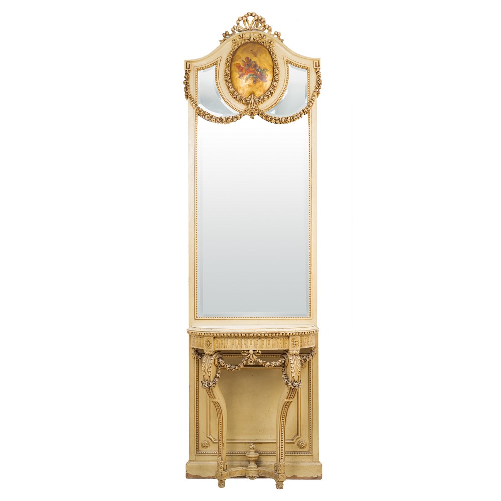 Consolle con specchiera stile Luigi XVI in legno laccato, nella parte superiore medaglione dipinto a mano raffigurante "Putti".