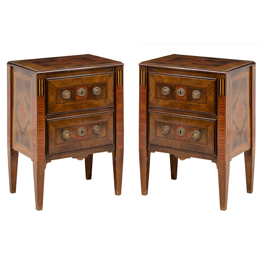 Coppia di comodini stile Luigi XVI a due cassetti in legno di noce, legno rosa, perfili in bosso.