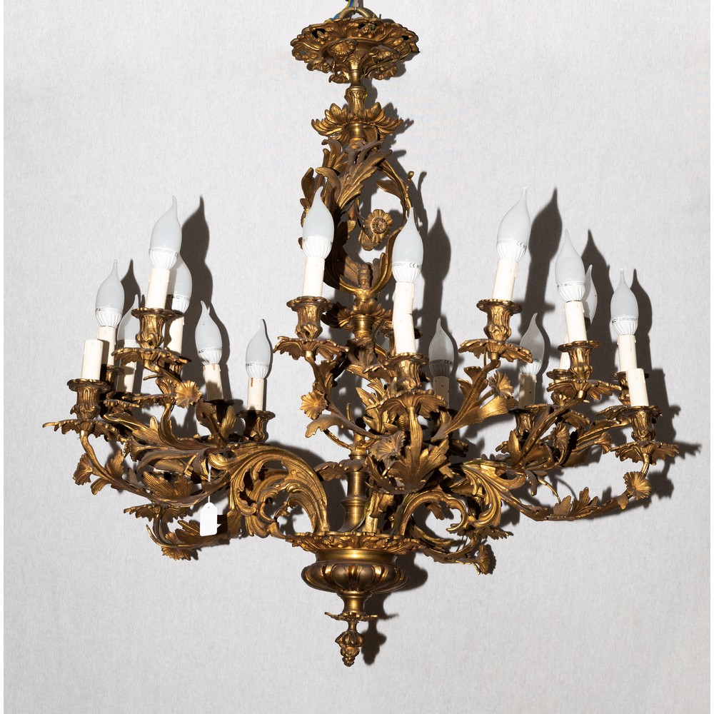 Lampadario stile Luigi XV in bronzo dorato a venti luci.
