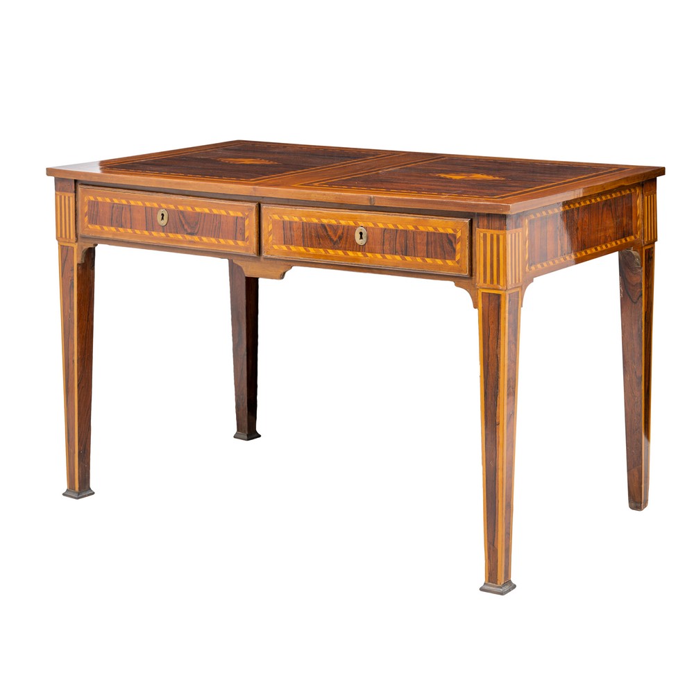 Scrittoio stile Luigi XVI a due cassetti in legno di noce, tarsie e riquadrature in bosso.