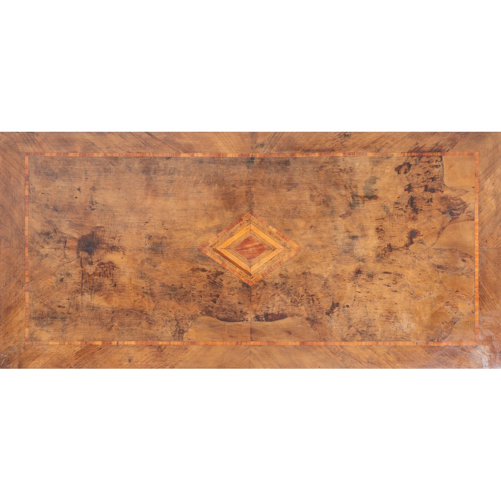 Cassettone Luigi XVI a due cassetti in legno di noce, tarsie a motivo geometrico in bois de rose.