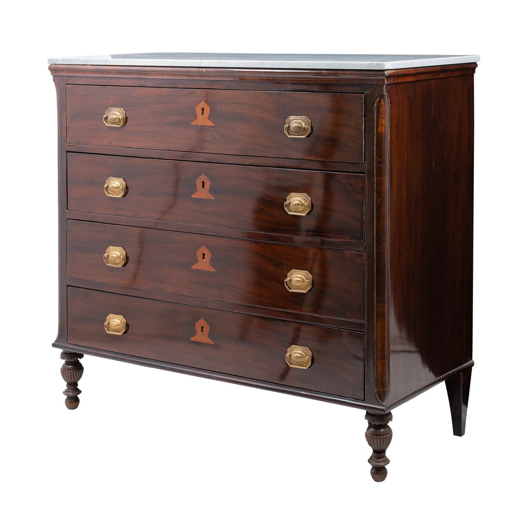 Cassettone Impero a quattro cassetti in legno di mogano, piano in marmo bianco di Carrara.