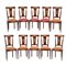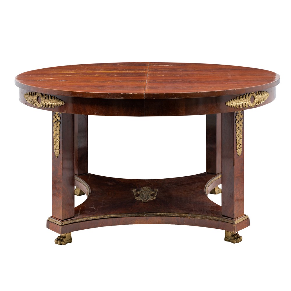 Tavolo circolare allungabile e dieci sedie stile Impero in legno di mogano e piuma di mogano, fregi in bronzo.