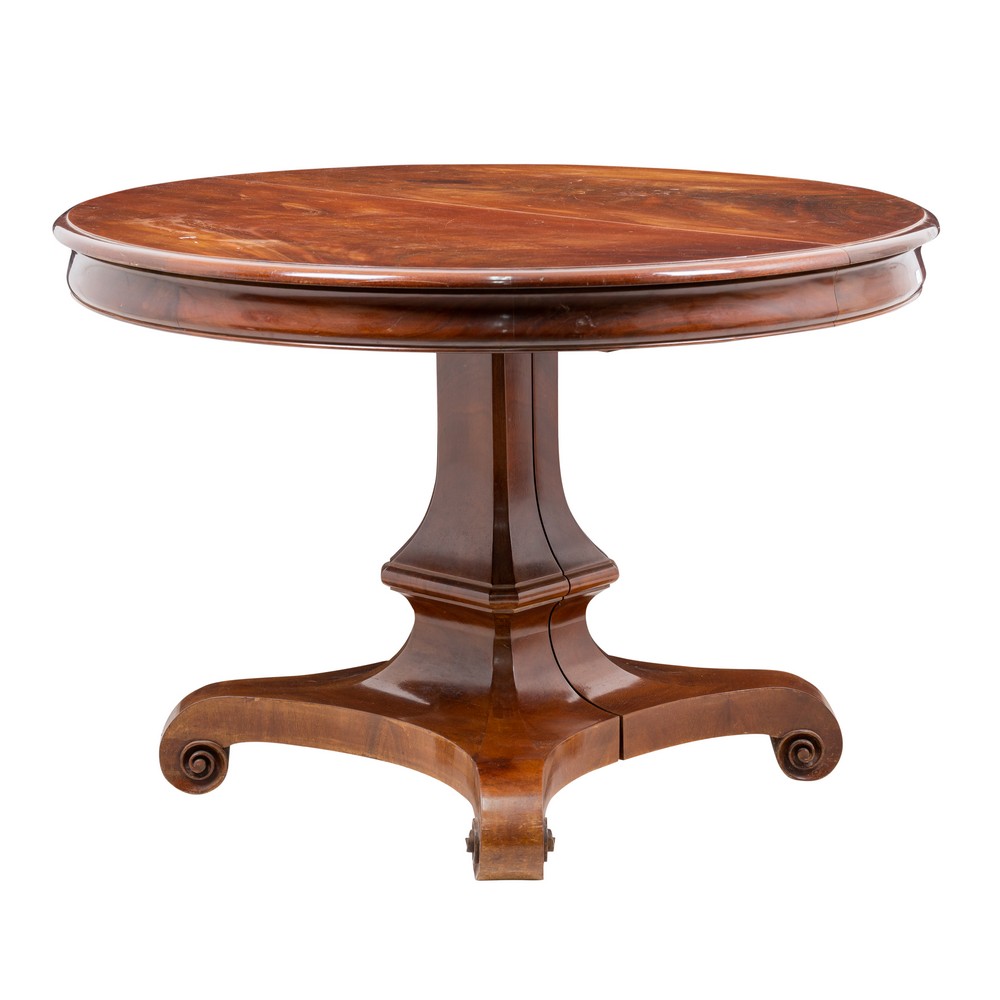 Tavolo allungabile in legno di mogano e piuma di mogano.