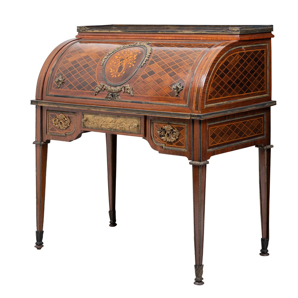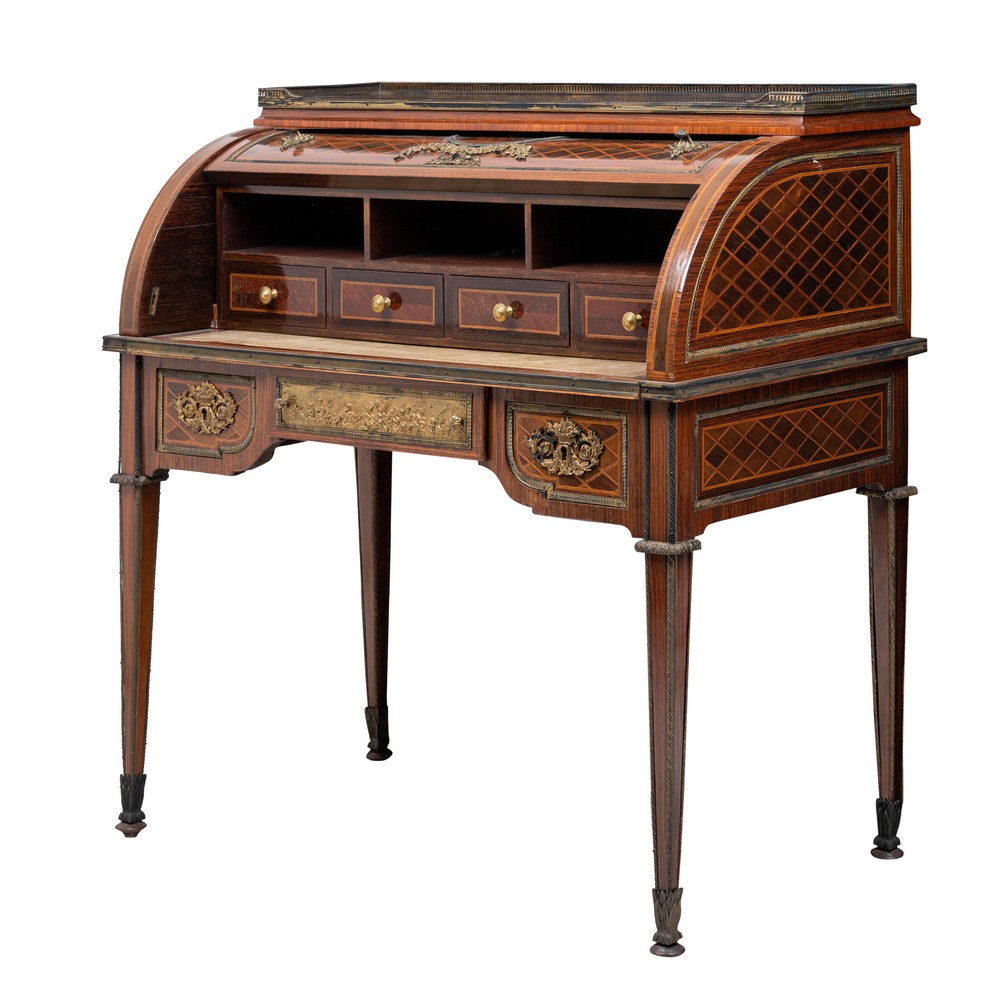 Scrittoio a rullo in legno di noce, marchetteria in legno di rosa ed esotico, guarniture in bronzo dorato.