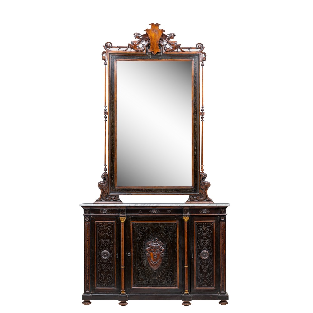 Etagere con specchiera in legno di noce ebanizzato, piano in marmo bianco venato, periodo umbertino.