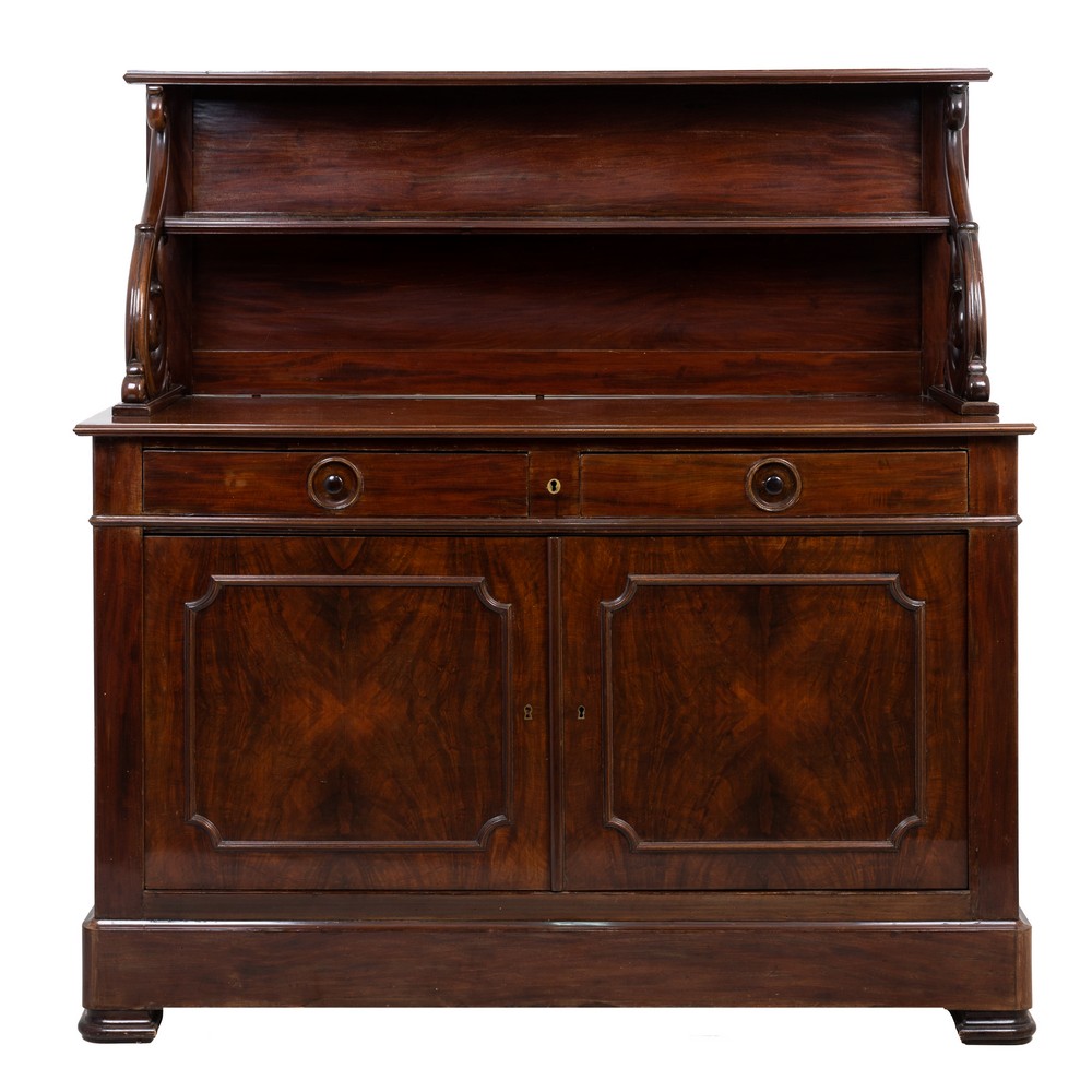 Piattaia con alzata a due ante e due cassetti in legno di mogano.