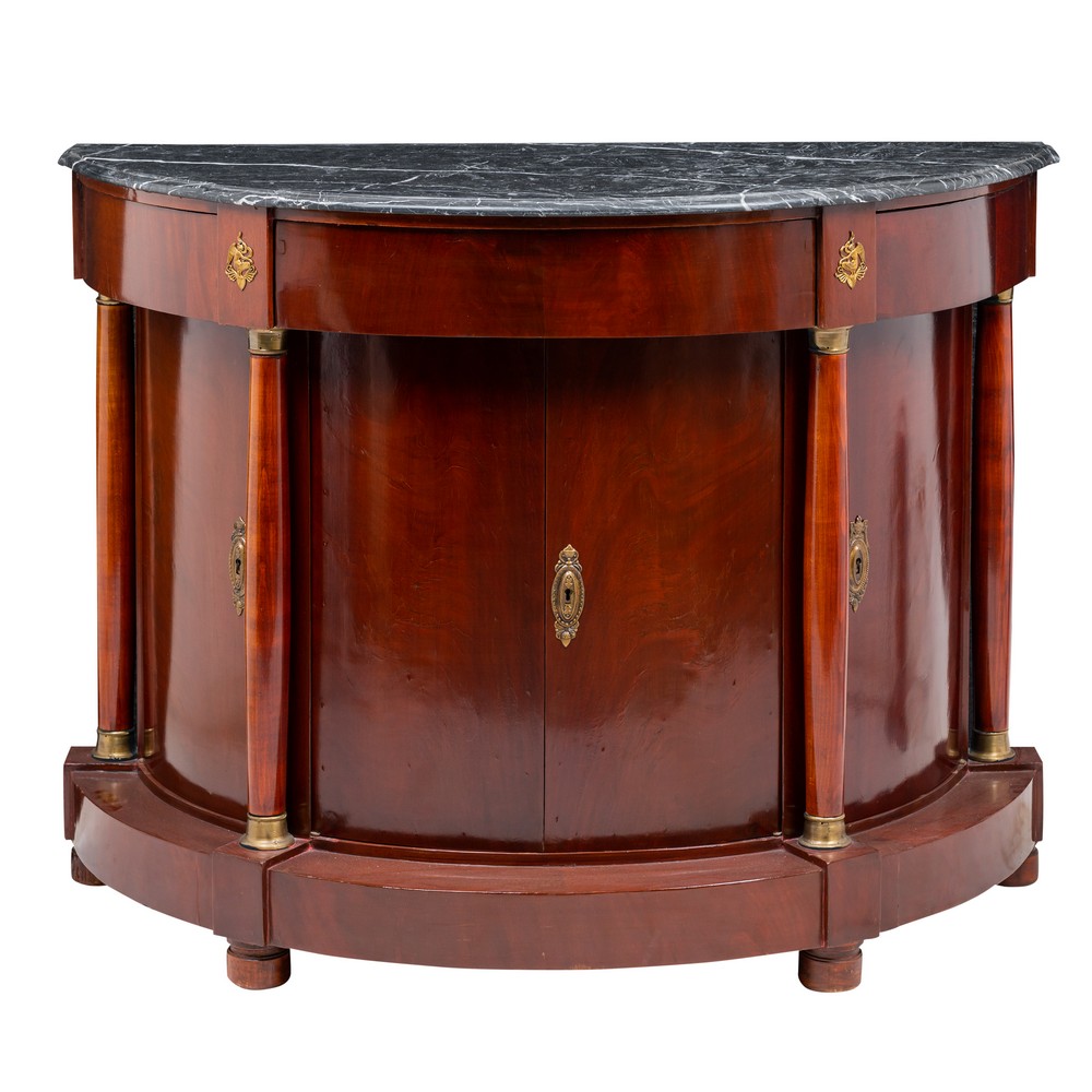 Credenza demi-lune stile Impero in legno di mogano e piuma di mogano, piano in marmo grigio venato.