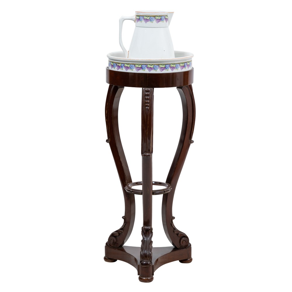 Bacile con brocca in ceramica smaltata e decorata con supporto in legno di mogano stile Impero.