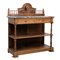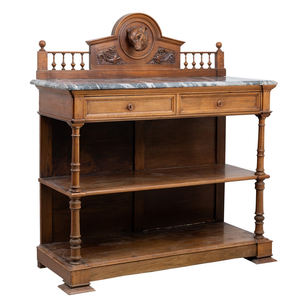 Etagere a due ripiani e due cassetti con ringhiera posteriore raffigurante "Testa di cane" in legno di noce, piano in marmo grigio venato.