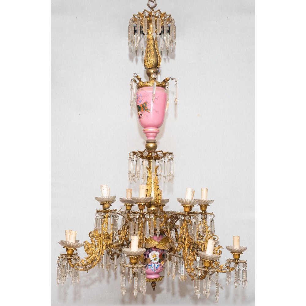 Lampadario a sedici luci in ottone dorato e opaline decorato, pendenti in vetro.
