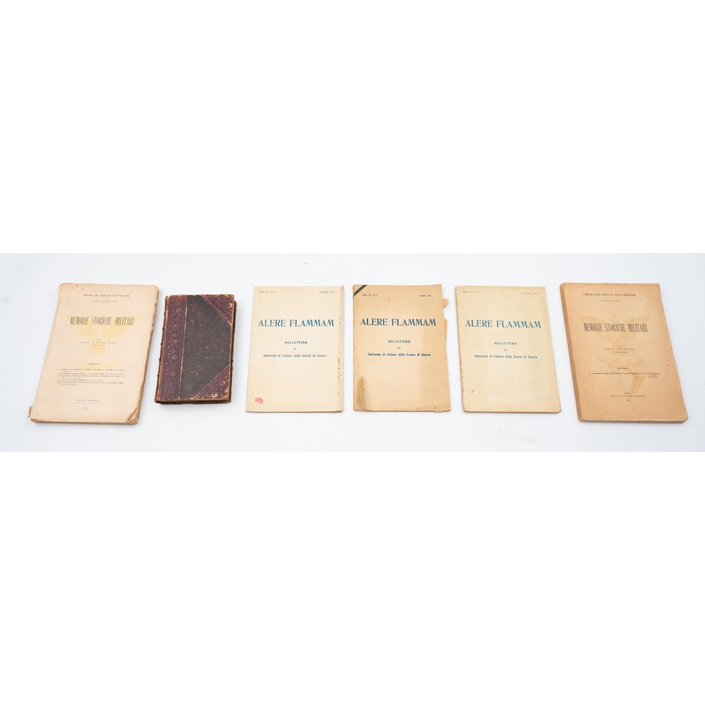 SEI TRA VOLUMI ED OPUSCOLI DI MILITARIA E VARIA: 1) MEMORIE STORICHE MILITARI, 2 volumi in 8° del 1912 (Fascicoli I e III) editi a Roma presso Officina Poligrafica Editrice e a Città di Castello presso Unione Arti Grafiche. In brossura editoriale. Volumi in buone condizioni. I Fascicoli sono ancora intonsi. Pp. 228; 703. 2) ALERE FLAMMAM, BOLLETTINO DEL GABINETTO DI CULTURA DELLA SCUOLA DI GUERRA. N. 3 bollettini del 1926. In 8°. Brossura editoriale. Volumi in buone condizioni. 3) Ugo Pesci IL RE MARTIRE, ed. Bologna, Zanichelli 1901. Bella e solida rilegatura coeva in mezza pelle con angoli e piatti marmorizzati. Contropiatti e fogli di guardia in seta con decori floreali. Pp. VIII, 432.