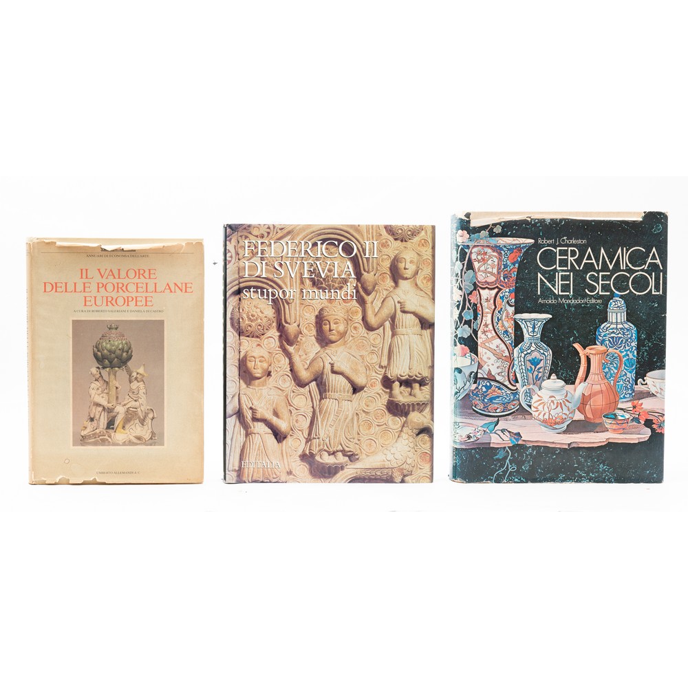TRE VOLUMI D’ARTE: 1) Franco Cardini – a cura di – FEDERICO II DI SVEVIA STUPOR MUNDI, ed. Editalia 1994. In 4° (cm. 32). Legatura editoriale in similpelle con sovraccoperta illustrata editoriale. Pp. [2], 255, [3]. Testi di Villari, Bigliardi, Cardini, Bernardini, Fatica, Carlino, Pecchioli, Bussagli, Losito. Illustrazioni nel testo in b/nero e a colori. Volume in ottime condizioni.2) Roberto Valeriani / Daniela Di Castro – a cura di - IL VALORE DELLE PORCELLANE EUROPEE, ed. Torino, Allemandi 1985. Le porcellane Europee del XVIII secolo, 1^ edizione. Collana Annuari dell'Economia dell'Arte. Legatura editoriale rigida con sovracoperta figurata. Formato cm 31 x 22. Pp. 214, illustrato con tavole in b/nero. piccole mancanze ai margini alti della sovracoperta, ma volume in ottime condizioni. 3) Robert J. Charleston CERAMICA NEI SECOLI, ed. Mondadori 1974. 2^ edizione. Presentazione di Giuseppe Liverani, traduzione di Adriana Dell'Orto e Giuseppina Pugliese Limentani. Legatura editoriale in piena tela grezza con titoli e decori in azzurro, sovracoperta editoriale illustrata, con normali usure d’uso, ma volume in ottime condizioni. Pp. 355 con numerose illustrazioni a colori ed in nero nei testi.