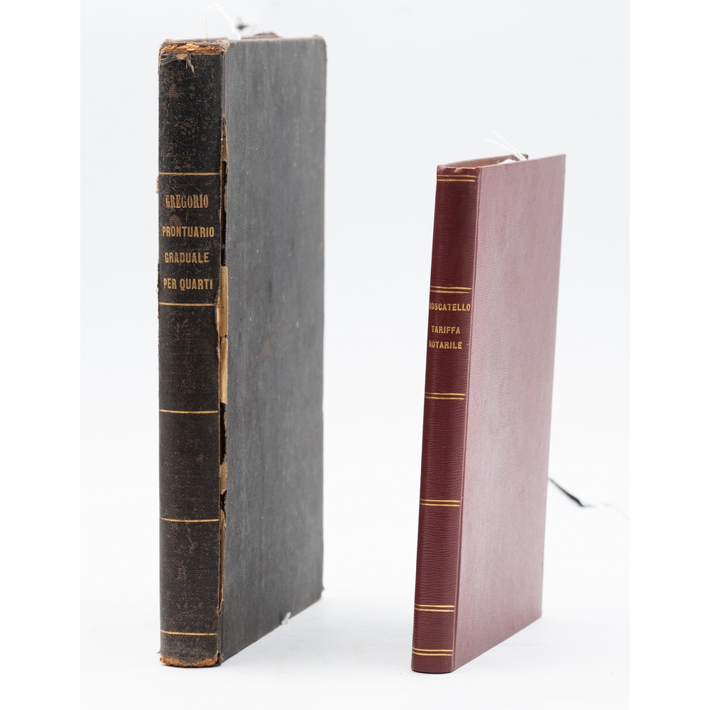DUE PRONTUARI E TARIFFARI PUBBLICATI A PALERMO TRA LA FINE DEL XIX E L’INIZIO DEL XX SECOLO: 1) Pietro Moscatello LA TARIFFA DEGLI ONORARI, DRITTI ED EMOLUMENTI, ed. Palermo, A. Giannitrapani 1886. In 8°. Legatura successiva in piena percallina rigida con titoli, filetti e fregi impressi in oro al dorso. Pagine pulite e ben tenute e volume in perfette condizioni. pp. 220. 2) Rosario Di Gregorio PRONTUARIO DEGLI INTERESSI GRADUALI PER QUARTI, ed. Palermo, Alberto Reber s. d. (ma 1905 circa). In 8° grande. Legatura coeva in piena percallina rigida, con titoli e filetti in oro al dorso. In più che discrete condizioni. pp. 184.