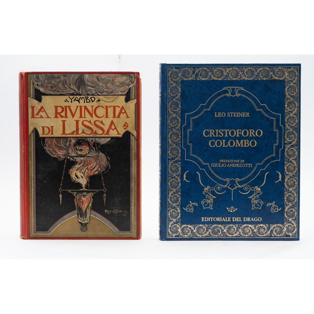 DUE VOLUMI PER RAGAZZI del XX secolo: 1) Yambo LA RIVINCIATA DI LISSA, ed. Roma, G. Scotti 1909. In 8° grande. Bella legatura editoriale in piena tela rigida figurata a rilievo e a colori su intarsi in pelle al piatto. Titolo anche al dorso. Volume in più che discrete condizioni. Yambo, pseudonimo di Enrico de' Conti Novelli da Bertinoro (Pisa, 1874 – Firenze 1943), è stato scrittore, illustratore, regista, e giornalista italiano, noto soprattutto per i suoi libri per ragazzi. Pp. 304. 2) Leo Steiner CRISTOFORO COLOMBO, ed. Editoriale del Drago 1992. Prefazione di Giulio Andreotti. Illustrazioni di Cesare Colombi. Bella legatura editoriale in balacron blu con titoli e impressioni in oro al piatto e al dorso. Contropiatti e guardie figurate con le mappe degli itinerari di Colombo. Pp. 255.