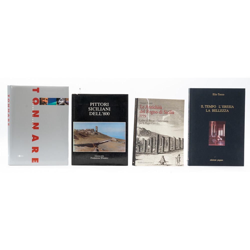 QUATTRO VOLUMI D’ARTE SULLA SICILIA: 1) Domenico Drago TONNARE, ed. l’Epos 1999. Testi di Giampiero Finocchiaro, prefazione di Folco Quilici, introduzione di Renato Tomasino. Il volume raccoglie gli straordinari scatti che ritraggono la mattanza siciliana, ritratti di uomini e di scene della pesca del tonno svolta nelle tonnare di Bonagia, Favignana e Scopello. Legatura editoriale rigida con sovracoperta illustrata. Cm 34 x 24. Pp. 271 con illustrazione a colori. 2) Giuseppe Pagnano LE ANTICHITÀ DEL REGNO DI SICILIA 1779. I PLANI DI BISCARI E TORREMUZZA PER LA REGIA CUSTODIA, ed. Arnaldo Lombardi Editore 2001. Brossura editoriale figurata. In ottime condizioni. Cm 21 x 29. Pp. 280 con illustrazioni in b/n e a colori. 3) Elio Tocco IL TEMPO L’ERESIA LA BELLEZZA, ed. Pegaso 1991. Legatura editoriale in tela nera con titoli in oro al piatto e al dorso. Fotoapplicazione al piatto anteriore. L’opera di uno dei più raffinati, profondi e disillusi uomini di cultura siciliani contemporanei. Cm 31 x 24. Pp. 230.4) Irma Mattarella PITTORI SICILIANI DELL’800, ed. Fondazione Whitaker 1982. In 4 (cm 24 x 30), pp. 30 con 125 tavole con riproduzioni di opere a colori. Interamente stampato su pagine di carta patinata. Legatura editoriale in tela con sovraccoperta illustrata. Catalogo della mostra svoltasi presso la Fondazione Whitaker di Palermo nel 1982.
