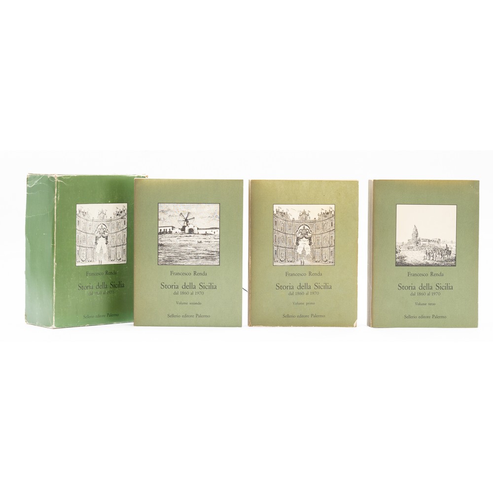 TRE VOLUMI IN COFANETTO: Francesco Renda STORIA DELLA SICILIA, ed. Sellerio 1987. In 8°. Legature editoriali con sopracoperte editoriali figurate. Tre volumi in cofanetto editoriale figurato a specchio. Normali usure d’uso al cofanetto e alle sopracoperte ma volumi in più che buone condizioni. Pp. 292, (4); 456, (4); 605, (8).