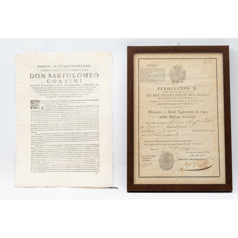 DUE DOCUMENTI A STAMPA DEL REGNO DELLE DUE SICILIE DEL XVIII E XIX SECOLO: 1) BANDO E COMANDAMENTO D’ORDINE DELL’ECCELLENTISSIMO SIGNORE DON BARTOLOMEO CORSINI, Principe di Sismano ecc. ecc. Il bando porta la data del 13 Agosto 1737. Il documento, su due facciate, misura cm 22 x 31. Il documento contiene la sigla P.S.P.V. Nei documenti del Regno delle Due Sicilie significa "Pari dei Sangui e dei Pari". Questo termine si riferisce ai membri della Camera legislativa del Regno, che erano nominati dal re Ferdinando II e rappresentavano i cittadini e i nobili. La sigla è quindi un indicatore di un ruolo politico all'interno del sistema amministrativo del Regno delle Due Sicilie. 2) LICENZA DI PORTO D’ARMI, datata 1847. Il documento, entro cornice novecentesca, misura cm 23 x 33.