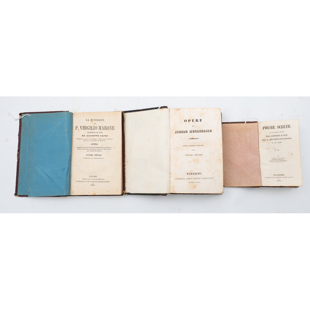 TRE OTTOCENTINE DI LETTERATURA PUBBLICATE A PALERMO: 1) Arcangelo Cordaro POESIE SCELTE, ed. Palermo, Fratelli Pedone Lauriel 1854. In 24°. Legatura coeva in mezza pelle con piatti rigidi in percallina impressi a secco a motivo floreale. Titoli, fregi e filetti in oro al dorso. Usure alla legatura ma pagine in perfette condizioni. pp. X, 564, (2).2) OPERE DI PIETRO METASTASIO, 1^ edizione siciliana, Palermo, Pedone e Muratori MDCCCXXXI. In 16°. Legatura coeva in mezza pelle con piatti rigidi in percallina impressi a secco a motivo floreale. Titoli, fregi e filetti in oro al dorso. Tomi 7 e 8 in unica rilegatura. Legatura con normali usure d’uso ma pagine in perfette condizioni. pp. 435, (4).3) Giuseppe Sapio LA BUCCOLICA DI P. VIRGILIO MARONE, ed. Palermo, Gaetano Priulla 1864. In 16°. Legatura coeva in piena percallina con piatti rigidi. Titoli e filetti in oro al dorso. In ottime condizioni. pp. XVI, 212.