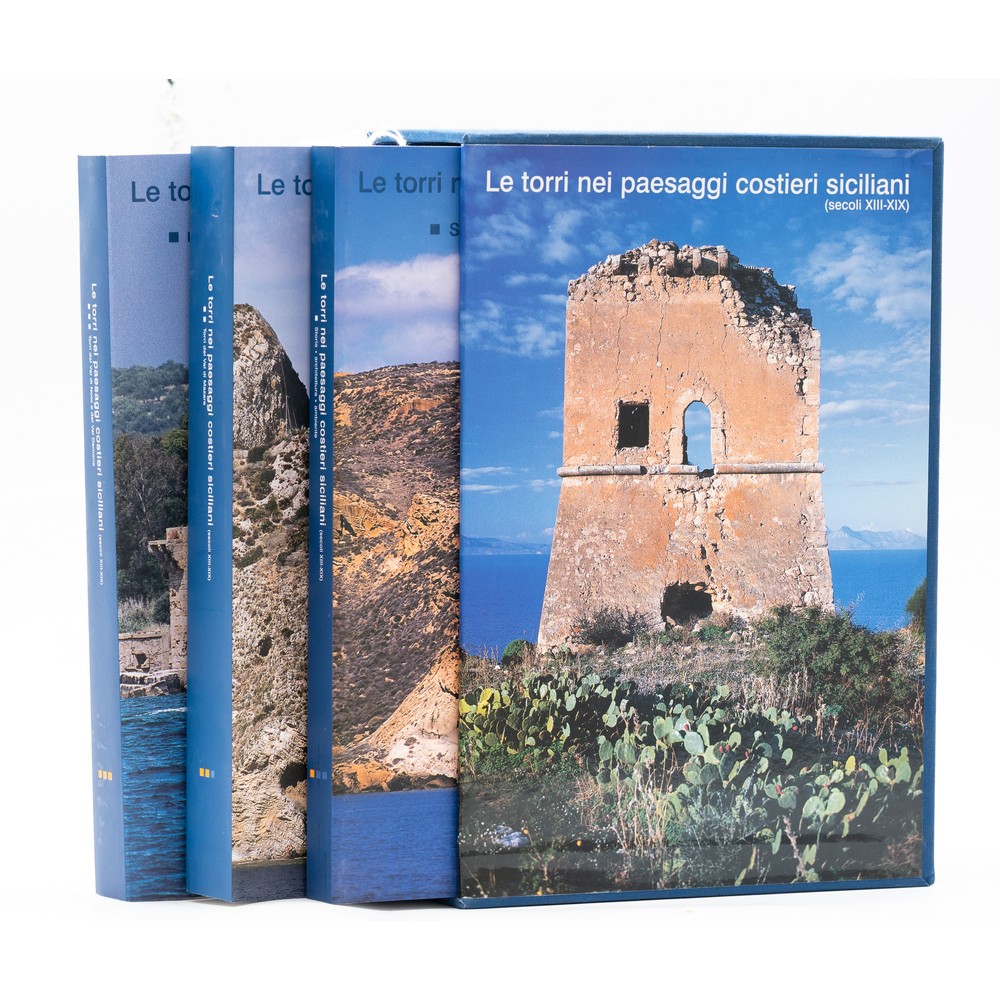 TRE VOLUMI IN COFANETTO SULLE TORRI E I CASTELLI SICILIANI: AA. VV. LE TORRI NEI PAESAGGI COSTIERI SICILIANI, ed. CRICD, 2008. 3 volumi in cofanetto rigido editoriale illustrato a specchio. Cm 30 x 21. Legature editoriali flessibili illustrate con ali. L’opera in tre volumi, corredati da un ricchissimo apparato fotografico, cartografico e bibliografico, si suddivide in: vol. 1 Storia, Architettura, Ambiente, pp. 316; vol. 2, Torri del Val di Mazara, pp. 631; vol. 3 Torri del Val di Noto e del Valdemone, pp. 473 (5). La presente pubblicazione è una delle opere più complete ed analitiche sulle torri costiere siciliane, con viste sia da terra che da mare ed analisi delle tecniche di costruzione. Volumi in perfette condizioni.