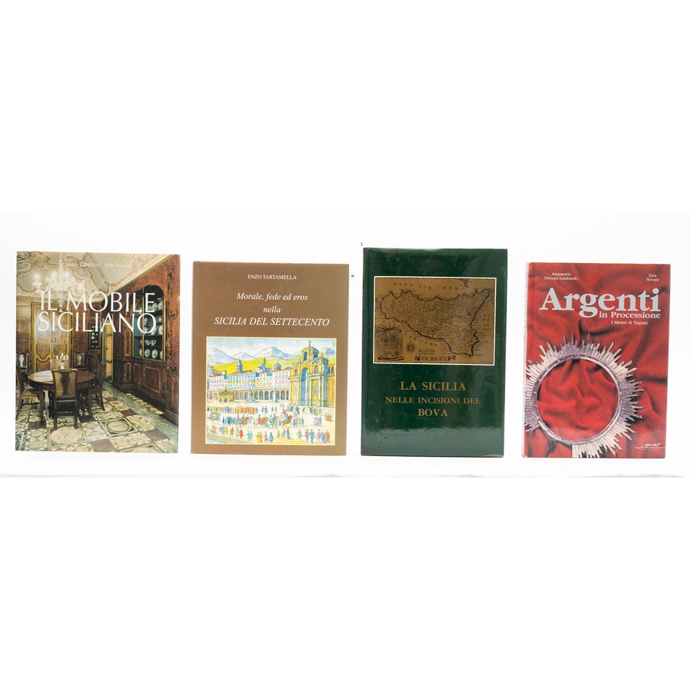 QUATTRO VOLUMI D’ARTE SULLA SICILIA : 1) Annamaria Precopi Lombardo / Lina Novara GLI ARGENTI IN PROCESSIONE. I MISTERI DI TRAPANI, ed. Marsala, Murex 1992. 1^ edizione. Legatura editoriale e sopracoperta editoriale illustrata. In 4°. Volume in perfette condizioni. Pp. XIV, 251. 2) Teresa Augello LA SICILIA NELLE INCISIONI DEL BOVA, Palermo 1983. Legatura editoriale con sopracoperta editoriale illustrata. Cm 32 x 22. Con testo introduttivo seguito da 91 incisioni in bianco e nero, su tavole ripiegate e con ampia didascalia. In perfette condizioni. 3) Mario Giarrizzo / Aldo Rotolo IL MOBILE SICILIANO DAL BAROCCO AL LIBERTY, ed. Flaccovio, Palermo 2004. Cm 25 x 31. Legatura editoriale in piena tela con titoli impressi in oro e sopracoperta editoriale illustrata. In perfette condizioni. pp. 222.4) Enzo Tartamella MORALE, FEDE ED EROS NELLA SICILIA DEL SETTTECENTO, ed. Trapani, Maroda 2003. Cm 24 x 30. Legatura editoriale in piena tela con titoli impressi in oro e sopracoperta editoriale illustrata. In perfette condizioni. pp. 340.