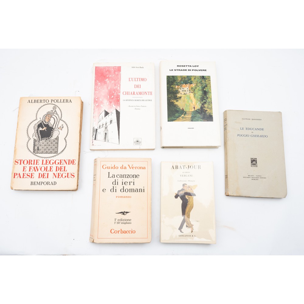 SEI VOLUMI DI LETTERATURA DEL XX SECOLO IN 1^ EDIZIONE: 1) Alberto Pollera STORIE LEGGENDE E FAVOLE DEL PAESE DEL NEGUS, ed. Firenze, R. Bemporad e F. 1936. Con 26 illustrazioni fuori testo. In 8°. Brossura editoriale figurata. Tagli irregolari. Volume in ottime condizioni con pagine ancora intonse. Pp. 243, (2). 2) Clotilde Margheri LE EDUCANDE DI POGGIO GHERARDO, ed. Milano – Napoli Riccardo Ricciardi 1963. Brossura editoriale con ali, figurata e marginosa. Tagli irregolari. Volume in ottime condizioni. Clotilde Marghieri (Napoli, 1897 – Roma, 1981) è stata una scrittrice italiana. Con questo volume si è aggiudicata il Premio Letterario Sebeto per le opere prime. Pp. 167. 3) Orio Vergani ABAT – JOUR, ed. Milano, Longanesi e C. 1973. In 16° grande. Brossura editoriale con acetato protettivo editoriale. Volume in perfette condizioni. Pp. 275, (12). 4) Guido da Verona LA CANZONE DI IERI E DI DOMANI, ed. Milano, Corbaccio 1932. Brossura editoriale. Tagli marginosi. Volume in ottime condizioni. Pp. 304. 5) Rosetta Loy LE STRADE DI POLVERE, ed. Einaudi 1987. In 8°. Legatura editoriale con sopracoperta editoriale illustrata. Pp. 240, (10). Con questo volume Rosetta Loy si è aggiudicata nel 1988: il Premio Campiello, il Premio Viareggio, il Premio Catanzaro e il Premio Rapallo Carige. 6) Adele Serio Basile L’ULTIMO DEI CHIARAMONTE, ed. Palermo, La Ginestra 1992. In 8°. Brossura editoriale figurata con ali. Volume in ottime condizioni con pagine pulite e ben tenute. Pp. 174.