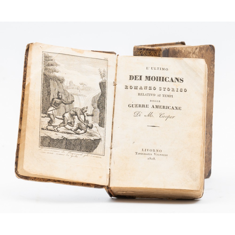 DUE OTTOCENTINE IN 16° di James Fenimore Cooper L’ULTIMO DEI MOHICANS, ed. Livorno Vignozzi 1828 - 1829. 2 tomi che contengono cinque libri. Legatura coeva in mezza pelle bruna, titolo e fregi impressi in oro ai dorsi. Con 5 incisioni xilografiche alle antiporte. Pp. 917 continuative. Il 1828 è l'anno in cui uscì la prima edizione italiana de "L'ultimo dei Mohicani". Molto raro.