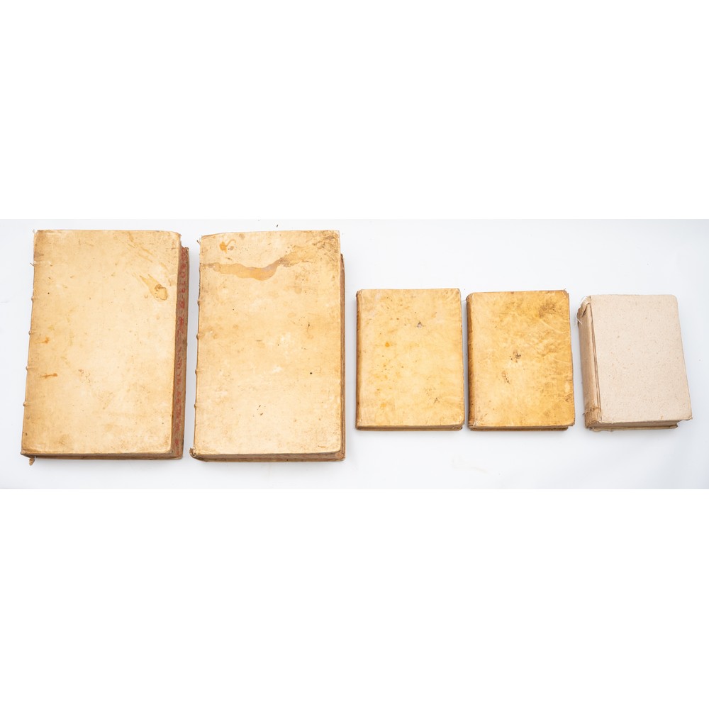 CINQUE SETTECENTINE DI TEOLOGIA: 1) Honoratus Tournely PRAELECTIONES THEOLOGICAE DE SACRAMENTO ORDINIS e PRAELECTIONES THEOLOGICAE DE SACRAMENTO MATRIMONII, ed. Venetiis, Apud Nicolaum Pezzana MDCCXXXI., ed. In 8°. Legatura coeva in cartonato rustico muto. Le due opere rilegate insieme, presentano pagine pulite e ben tenute ancora fragranti. Testatine finemente incise. In antiporta ex libris manoscritto del Vescovo di Cagli e Pergola Carlo Monti (fu Vescovo dal 25 maggio 1818 al 7gennaio 1842). Honoré Tournély (1658 – 1729) è stato un teologo francese. Conseguito il dottorato in teologia e filosofia alla Sorbona, insegna poi all'Università di Douai, istituita nel 1562 da re Filippo II per contrastare la Riforma protestante. Fermo oppositore del giansenismo, fa rientro a Parigi per la docenza di teologia, che conserva per un quarto di secolo ove pubblica le sue lezioni accademiche come "Praelectiones theologicae". Pp. ( 16), 360; 299. 2) Claudio La Croix "THEOLOGIA MORALIS ANTEHAC BREVITER CONCINNATA AR. P. HERM. BUSEMBAUM SOCIETATIS JESU, SS. THEOLOGIAE LICENTIATO; NUNC PLURIBUS PARTIBUS AUCTA AR. P. CLAUDIO LACROIX….", editio novissima, Venetiis apud Nicolaum Pezzana 1740. 2 volumi in folio. Questi volumi del La Croix vertono sull’opera di Hermann Busembaum che fu un insigne teologo morale (1600 - 1668) i cui insegnamenti e le cui pubblicazioni di Teologia Morale vennero diffusi in tutti i principali centri di dottrina cattolica per oltre 200 anni. La sua principale opera venne successivamente ampliata da Claudio Lacroix nella presente pubblicazione. Legatura in piena pergamena, belle nervature, fregi e titoli in oro incisi ai tasselli e al dorso. Tomo I frontespizio bicromia. Belle testatine incise. Capilettera e finalini artistici. Belle incisioni all’acquaforte all’interno. Praefatio ; I – LVI introduzione e indice; 476 pagg.; Tomo II frontespizio e I – VI prefazione con indice; 496 pagg.; 152 pagg. di Index Locupletissimus. Leggere fioriture interne. Qualche leggera macchia poco significativa al Tomo II. Una piccola mancanza al dorso al taglio superiore. Tagli spruzzati in rosso. All’interno foglio manoscritto con glosse. 3) Anacleto Reiffenstuel THEOLOGIA MORALIS, ed. Bassaani, MDCCLXXX, apud Remondini. 2 tomi ( I e II) in 8° grande. Legature coeve in piena pergamena rigida con titoli impressi ai dorsi. Qualche sporadica fioritura ma volumi in eccellenti condizioni. Incipit, testatine e finalini xilografici, finemente incisi. Pagine stampate su due colonne. Anaklet Reiffenstuel (1642 – 1703) è stato un teologo tedesco. Nato in Baviera vicino al Tirolo, entrò nell'ordine francescano con il nome di Anaklet (nato Johann Georg). Si dedicò alla docenza della teologia morale, della filosofia e del diritto canonico. Scrisse importanti opere di divulgazione, in particolare la Theologia moralis e lo Ius canonicum universum, di cui le edizioni veneziane sono le più complete. Le sue opere hanno influenzato a lungo le decisioni della Sacra Rota ( fonte: https://it.wikipedia.org/wiki/Anaklet_Reiffenstuel). Pp. XVI, 335; 362.